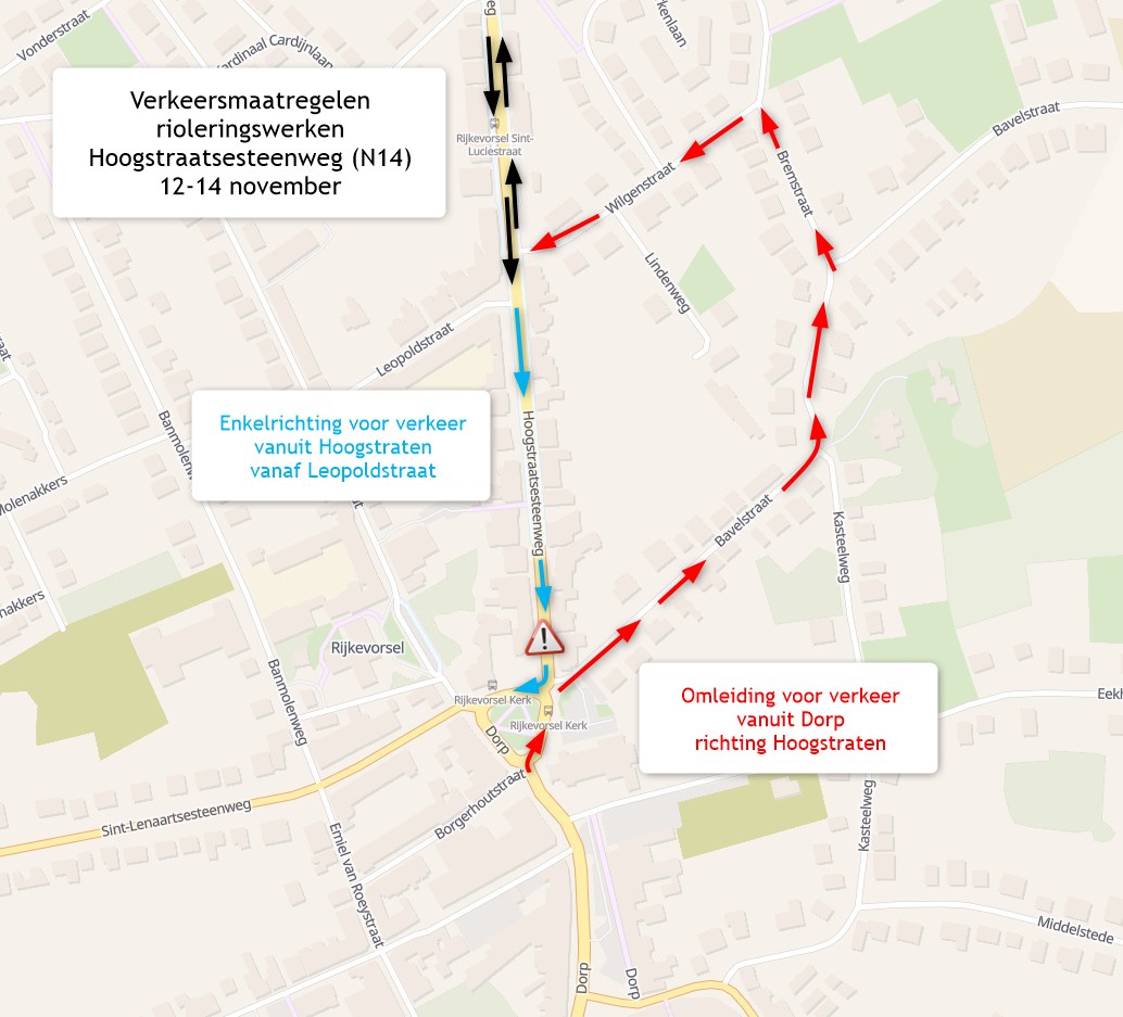 Van woensdag 12 tot en met vrijdag 14 november voert een aannemer in opdracht van Pidpa rioleringswerken uit aan de Hoogstraatsesteenweg (N14), vlak bij de rotonde. Tijdens deze werken gelden tijdelijke verkeersmaatregelen in het centrum van Rijkevorsel.