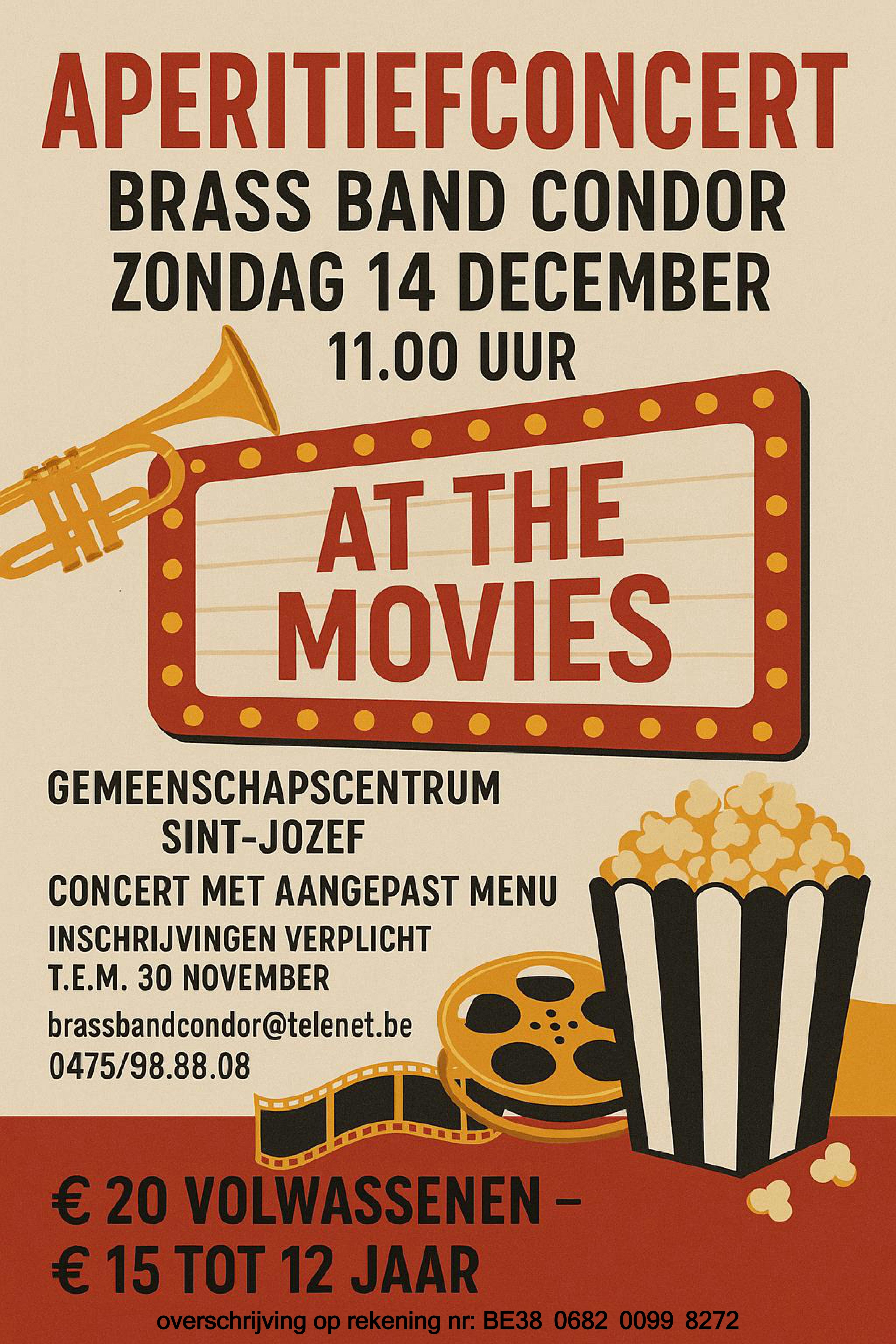 Op zondag 14 december 2025 nodigt Brassband Condor je uit op hun aperitiefconcert. Tijdens dit concert beleef je mooie filmmuziek in combinatie met een aangepast concertmenu.