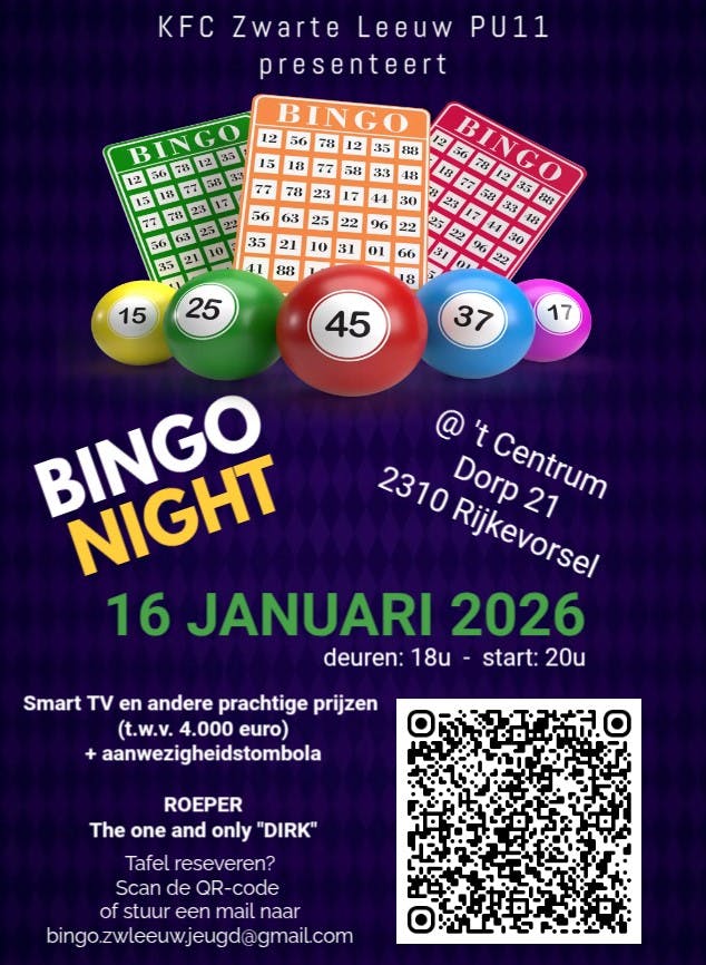 Voetbalspelers PU11 van KFC Zwarte Leeuw organiseren een bingo om de ploegpot te spijzen in het kader van een meerdaags tornooi aan zee. Iedereen kan deelnemen en gedurende 12 rondes prachtige prijzen winnen waaronder een Smart TV (prijzenpot +/- 4.000 euro). Tevens wordt een aanwezigheidstombola georganiseerd.