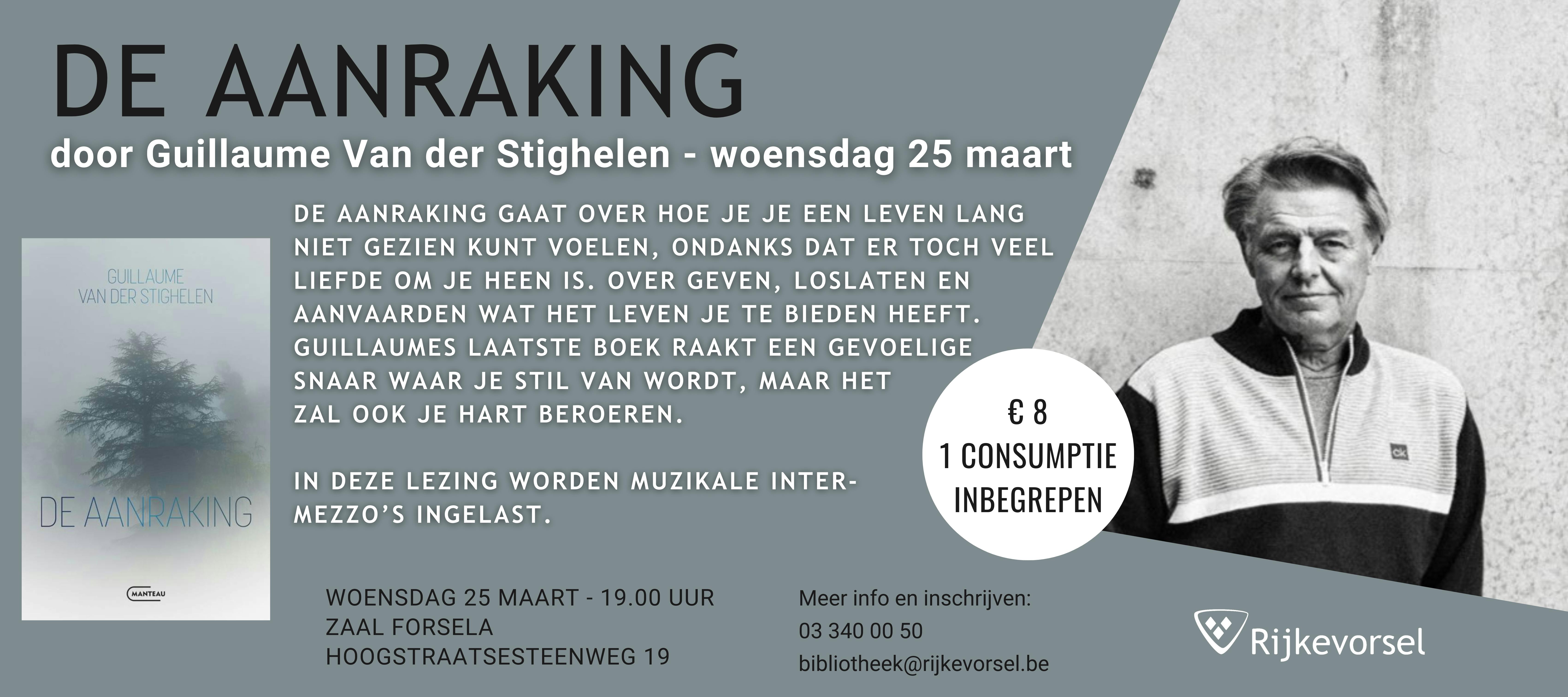 Op woensdag 25 maart komt auteur Guillaume Van der Stighelen vertellen over zijn nieuwste boek, De Aanraking. Het boek gaat over hoe je je een leven lang niet gezien kunt voelen, ondanks dat er toch veel liefde om je heen is. Het gaat over geven, loslaten en aanvaarden wat het leven je te bieden heeft.