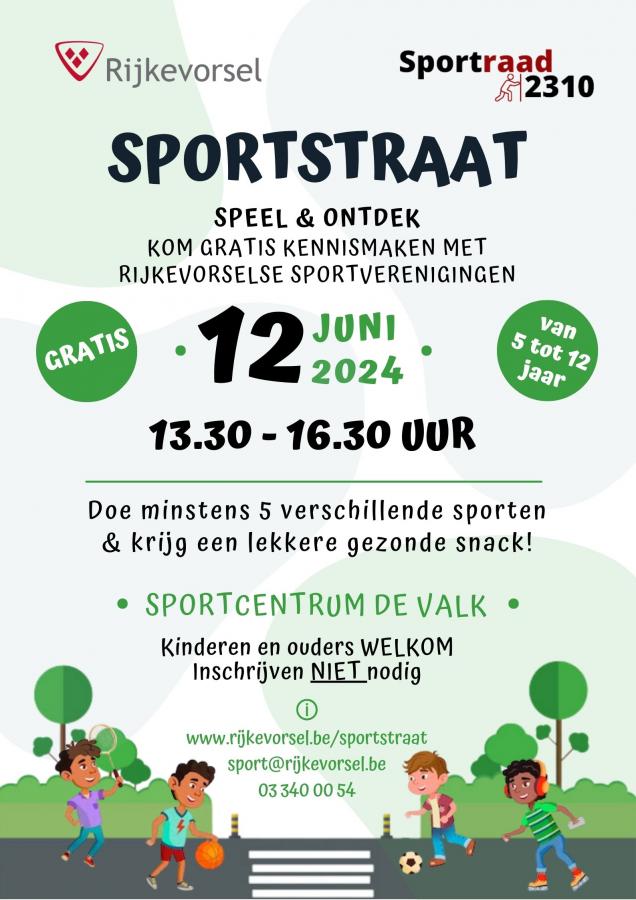 De Sportstraat is een initiatief waarbij kinderen een namiddag vrij kunnen rondlopen in Sport- en recreatiezone Sonsheide. Over het hele domein zullen op woensdag 4 juni tussen 13.30 uur en 16.30 uur verschillende sporten hun plaats innemen. Zo zullen zowel sportclubs uit onze gemeente alsook 'nieuwe', minder gekende sporten aanwezig zijn. De aanwezige sportclubs voorzien een door hen vrij in te vullen initiatie.